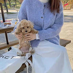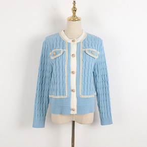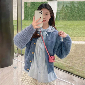 蓝色毛衣女秋春装新款韩版四口袋单排扣长袖针织外套现...