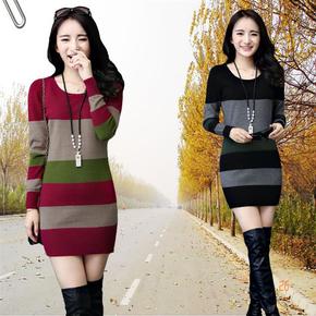 动感毛衣女修身包臀中长款长袖条纹打底针织衫外穿...