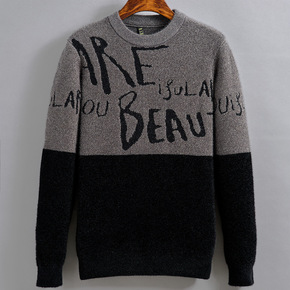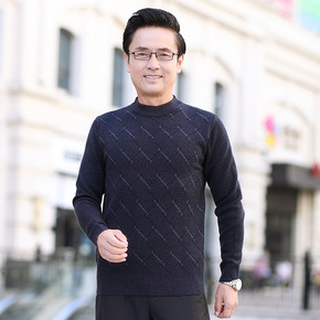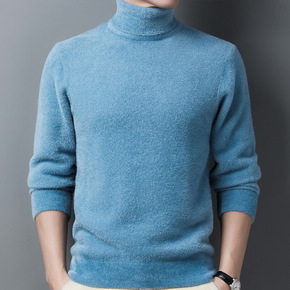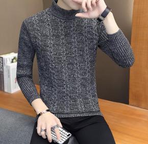 秋冬时尚提花圆领套头毛衣男士潮流修身高领毛衫纯色青...