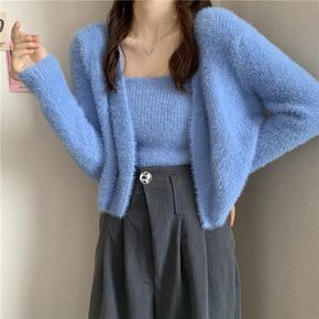 针织衫两件套纯色仿貂绒小开衫抹胸吊带名媛风学生上衣...