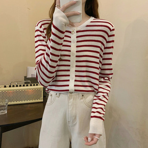 条纹针织开衫外套女秋冬装2021新款韩版甜美外搭薄...