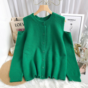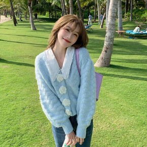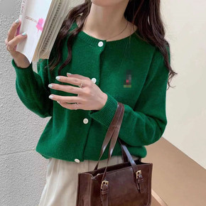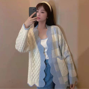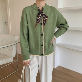 秋冬新款撞色长袖针织开衫女秋宽松设计感短款蓝绿色毛...