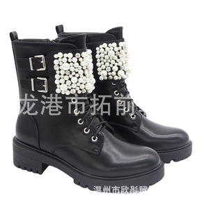 秋冬季跨境罗马珍珠系带女靴 欧美手工串珠平底女鞋 ...