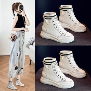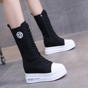 2021秋季新款韩版高帮女式休闲帆布鞋拉链长筒靴子...