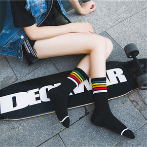 春夏新款女袜运动休闲彩虹棉袜透气吸汗中筒袜子批发堆...
