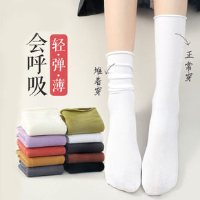 堆堆袜女日系咖色双针纯色女士中筒袜jk森系竖条纹长...