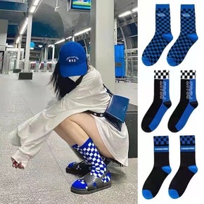 韩国东大门克莱因蓝潮袜 时尚棋盘格字母中筒袜小红书...
