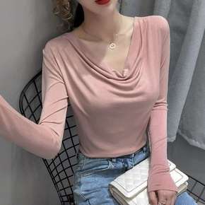 精梳棉 抗起球 堆堆领长袖T恤女修身显瘦秋装新款设...