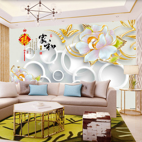 年年有余客厅电视背景墙壁纸 中式沙发无缝3D立体古...