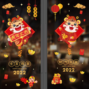 2022新年快乐虎年可爱墙贴玻璃门新春节日店铺橱窗...