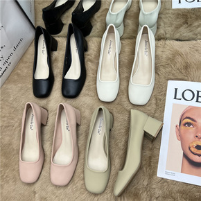 粗跟平底单鞋浅口低帮方头中跟一脚蹬女鞋气质复古软皮...
