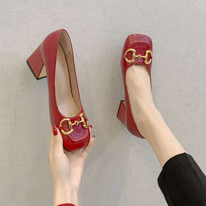 红色高跟鞋女2022新款春秋百搭马衔扣法式粗跟单鞋...