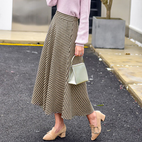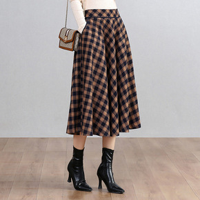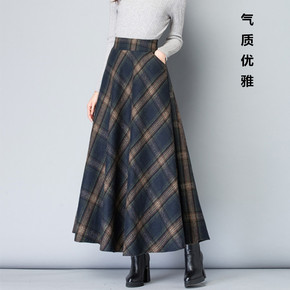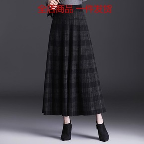 秋冬毛呢格子中长裙女复古新款大码半身裙字大摆裙高腰...