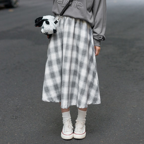 格子半身裙女秋冬新款高腰大摆a字裙垂感收腰中长款休...