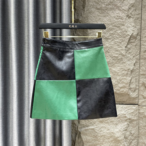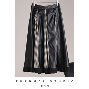 FUNOFF 高腰复古格子拼接百褶半身裙女链条皮裙...