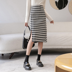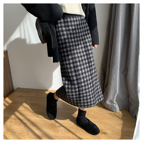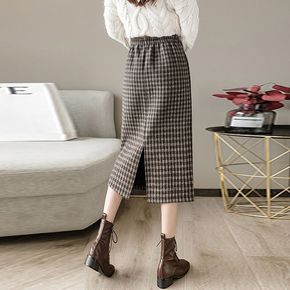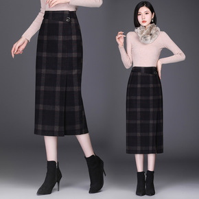 毛呢格子半身裙女秋冬韩版气质中长裙高腰显瘦开叉包臀...