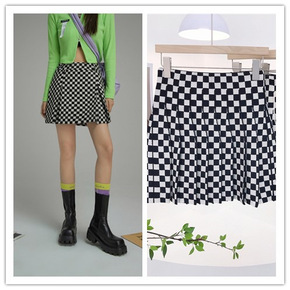 6732#时髦复古纯欲辣妹气质黑白棋盘格高腰百褶半...