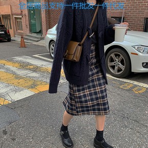 格子针织大摆裙中长款高腰a字半身裙女秋冬加厚毛线百...