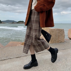 包臀裙韩版宽松中长款格子半身裙女秋冬复古高腰开叉一...