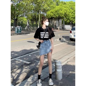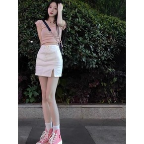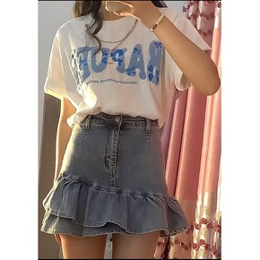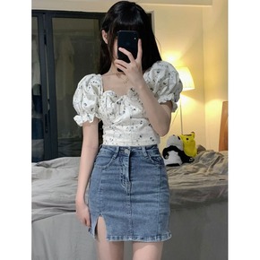 小个子纯欲风穿搭白色碎花泡泡袖上衣牛仔包臀短裙辣妹...