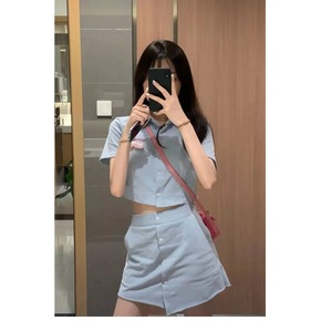 网红小个子可盐可甜穿搭蓝色短款衬衫半身裙纯欲风辣妹...