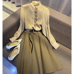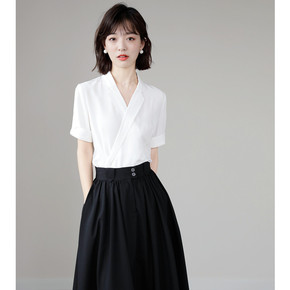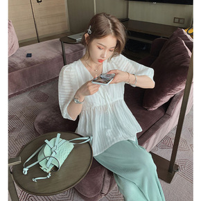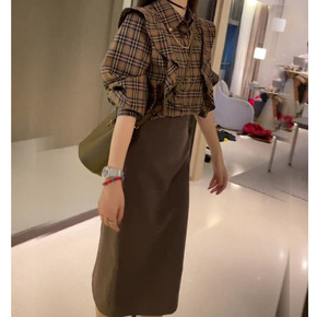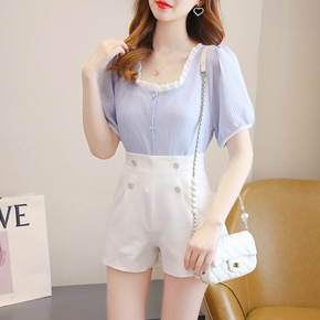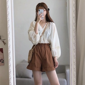 泡泡袖衬衣短裤子两件套chic港风复古网红炸街盐系...