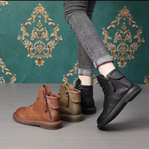 皮面小短靴子英伦风马丁靴春秋季平底单靴棕色复古女靴...