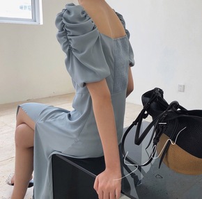 夏季新法式复古宫廷风方领泡泡袖连衣裙高腰开叉赫本风...