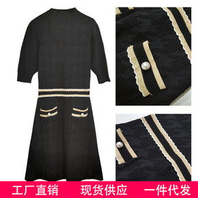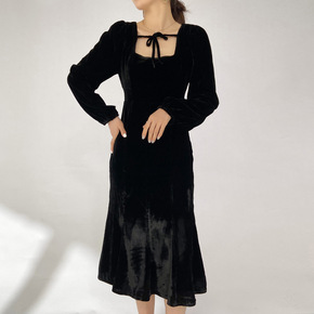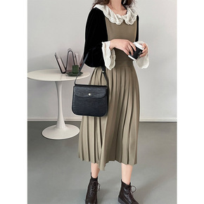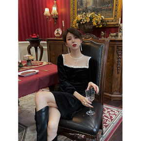 U 蕾丝花边拼接连衣裙秋冬小众复古设计感纯色打底长...