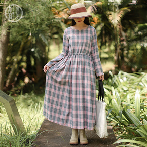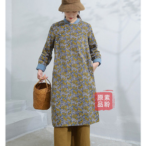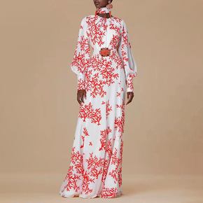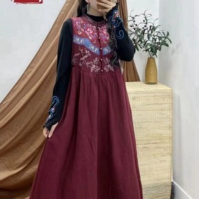 高级感国风复古印花长裙2021秋冬新款圆领个性系带...