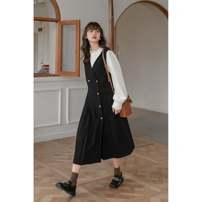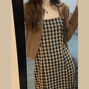 早秋2021新款冷淡风女装高级感长袖格子吊带连衣裙...