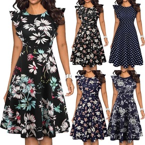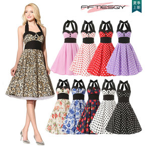 亚马逊欧美女装跨境热卖挂脖纽扣波点花型复古连衣裙女...