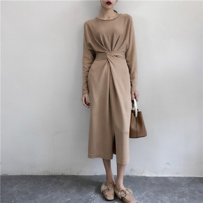 秋款法式复古气质针织连衣裙长袖收腰系带宽松显瘦打底...