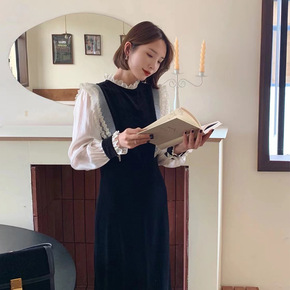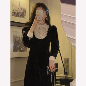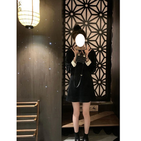 复古港味假两件收腰长袖连衣裙女春秋小个子设计感大码...