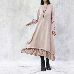 文艺宽松针织连衣裙2021秋冬蕾丝拼接纯色中长裙百...