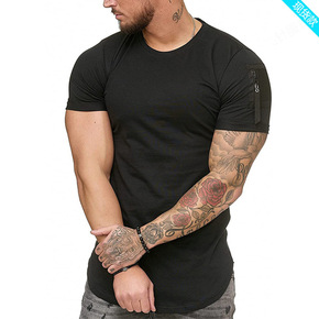 欧美跨境圆领纯色t恤男士夏季大码肩部个性拉链口袋短...