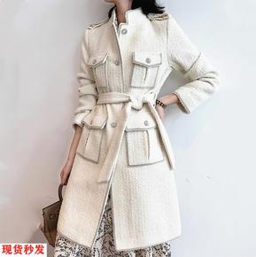 2021秋冬装白色小香风毛呢编织外套女气质收腰中长...