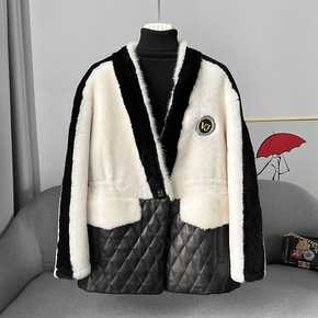 2021冬季新款中长款真皮皮毛一体外套女黑白拼接绵...