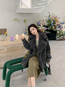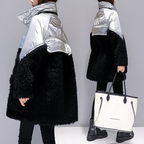 2021新款女装冬季宽松中长款羽绒服女羊羔毛拼接撞...