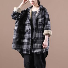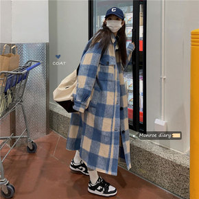 冬装2021新款女韩版宽松大码文艺呢料格子衬衫羊羔...