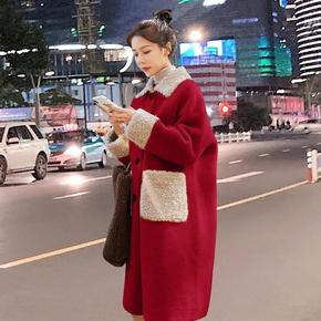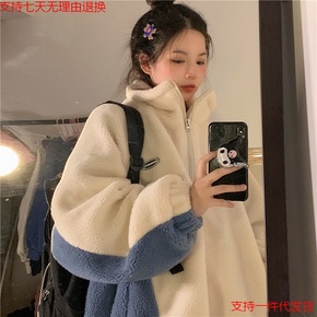仿羊羔毛棉衣外套冬季2021新款拼色立领加厚宽松中...