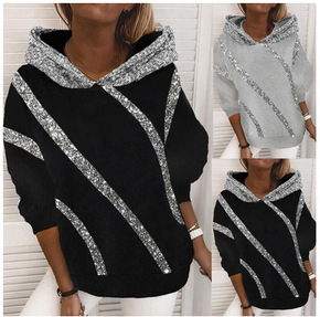 速卖通亚马逊秋冬爆款欧美热卖亮片印花宽松连帽卫衣女...