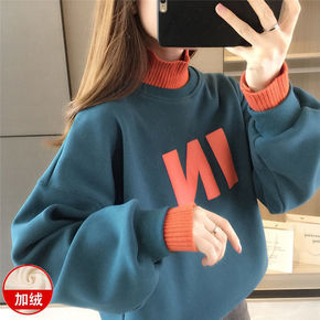 假两件卫衣女秋冬新款韩版加绒加厚半高领少女宽松时尚...