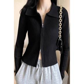 黑色长袖女短款开衫双拉链上衣针织衫毛衣修身秋装外套...