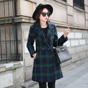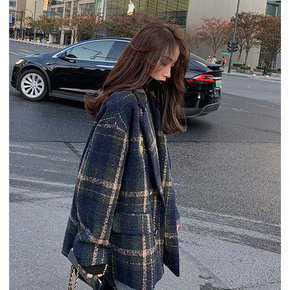 实拍秋冬新款大衣中长款气质格子长袖优雅毛呢外套...
