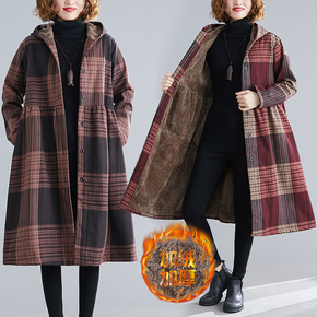 格子加绒加厚外套女2021秋冬新款中长款风衣宽松修...