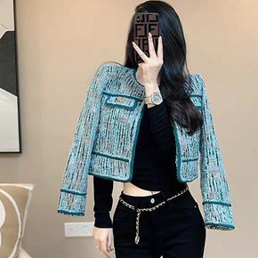 香香风粗花呢短款外套女秋冬显廋设计师款编织上衣复古...