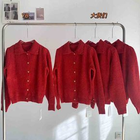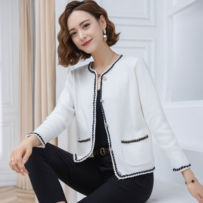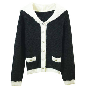 M家21秋冬新款撞色翻领针织开衫女小香风短款长袖外...