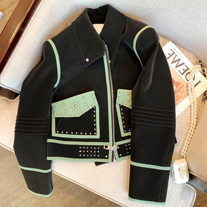 韩国秋冬新款设计感小众甜酷机车短款铆钉撞色拼接翻领...