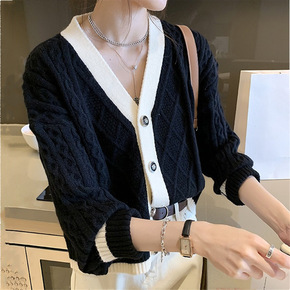 针织开衫女装短款秋装2021年新款宽松撞色上衣女单...